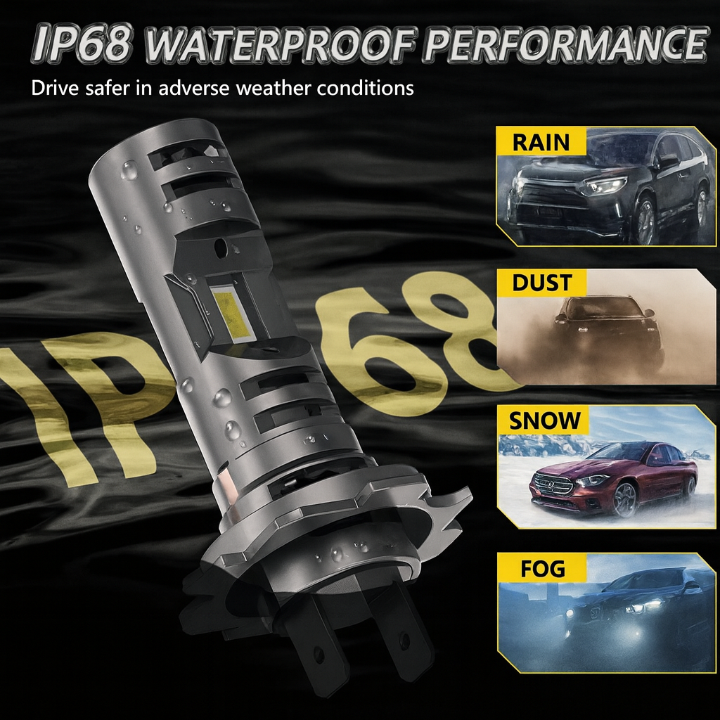 Gradul de protecție IP68 le face complet impermeabile și rezistente la praf sau ceată, ceea ce înseamnă că pot fi folosite fără probleme în orice anotimp sau vreme. Fie că este vorba despre ploi torențiale, ninsoare abundentă sau drumuri acoperite de praf, aceste becuri rămân la fel de eficiente și fiabile.