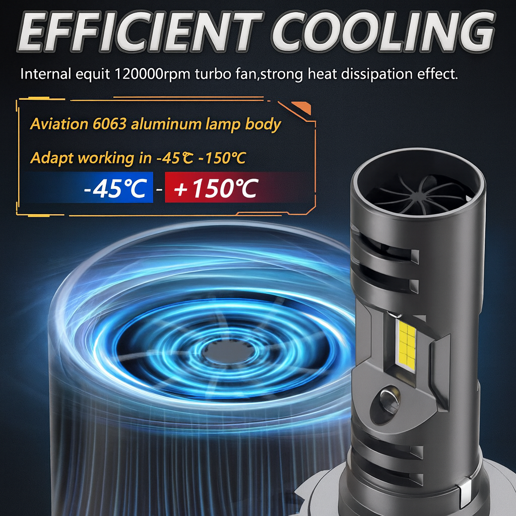 Construcția robustă este un alt punct forte al acestui produs. Carcasa este realizată din aluminiu de calitate superioară, folosit și în industria aeronautică (6063), ceea ce asigură o disipare optimă a căldurii și o rezistență de durată. În plus, fiecare bec este dotat cu două ventilatoare de 12.000 RPM, care contribuie la o răcire activă extrem de eficientă. Această combinație permite o funcționare stabilă chiar și la temperaturi extreme, de la -45°C până la +150°C, fără riscul de supraîncălzire sau defectare.