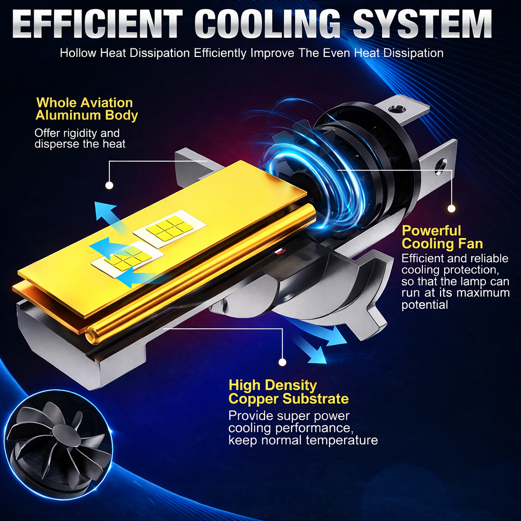 Din punct de vedere tehnic, fiecare bec este echipat cu tehnologie CSP modernă și sistem de răcire eficient, format din cooler integrat și radiator din aluminiu. Această combinație permite disiparea rapidă a căldurii și menține temperatura de funcționare în parametri optimi, chiar și în condiții de utilizare intensă. Puterea de 35W pe set asigură un consum redus de energie, fără a suprasolicita instalația electrică a vehiculului, oferind totodată o performanță superioară față de halogen.