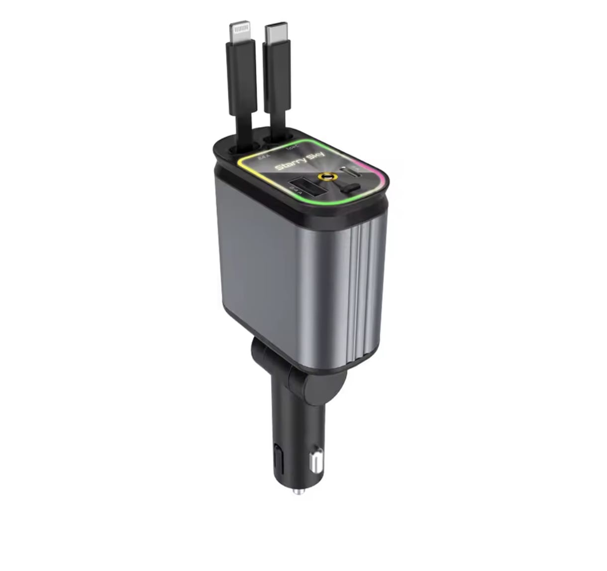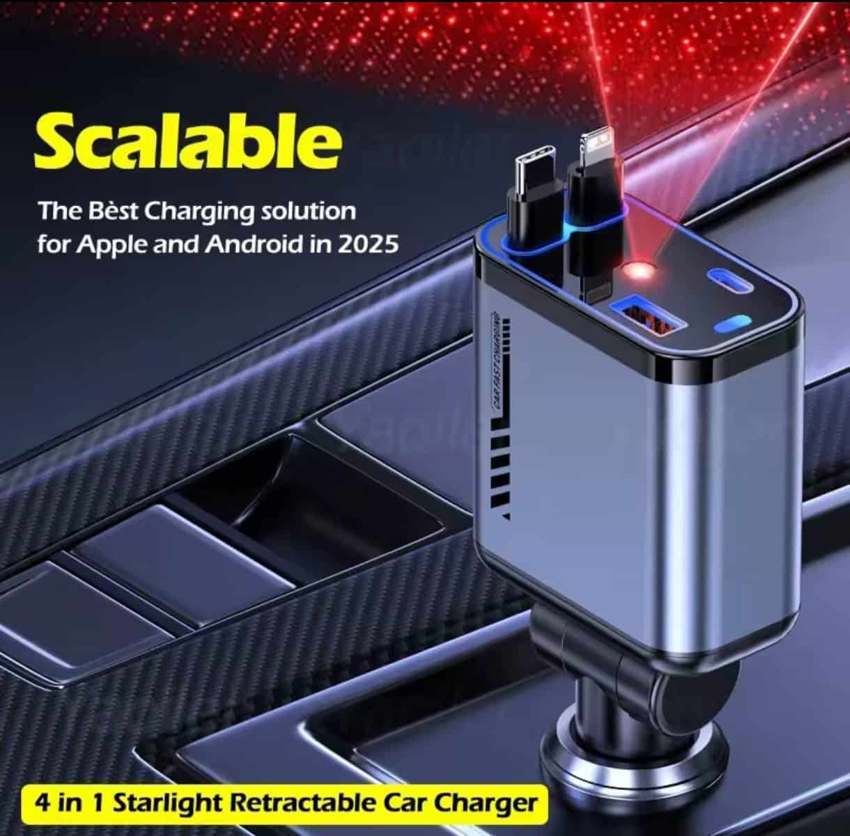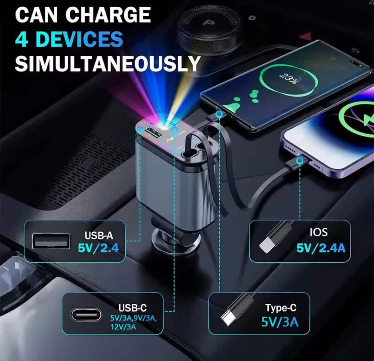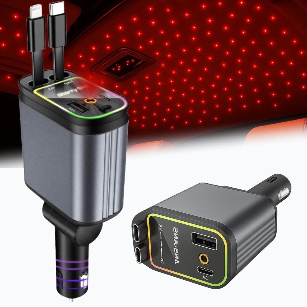 Încărcător Auto 4 în 1 pentru Bricheta cu Cabluri Retractabile Type-C și iPhone, Încărcare Rapidă USB-A/USB-C, Proiecție LED Cer Înstelat pe Plafon, Organizare Cabluri Auto, Compatibil cu Toate Modelele Auto – Fast Charge și Design Rotativ 180° AutoREY®