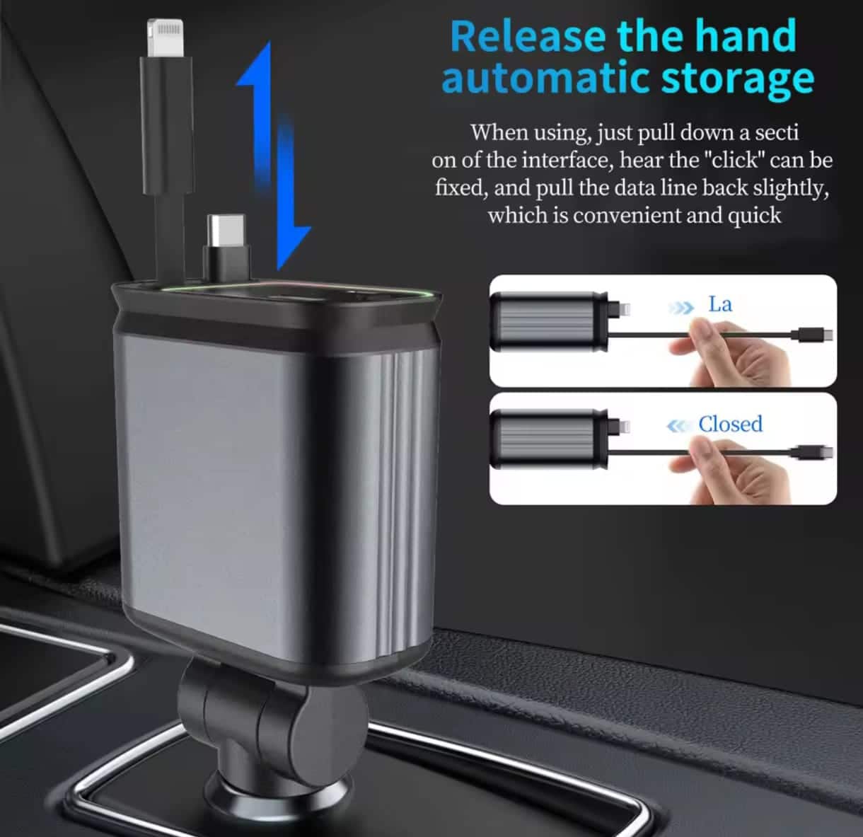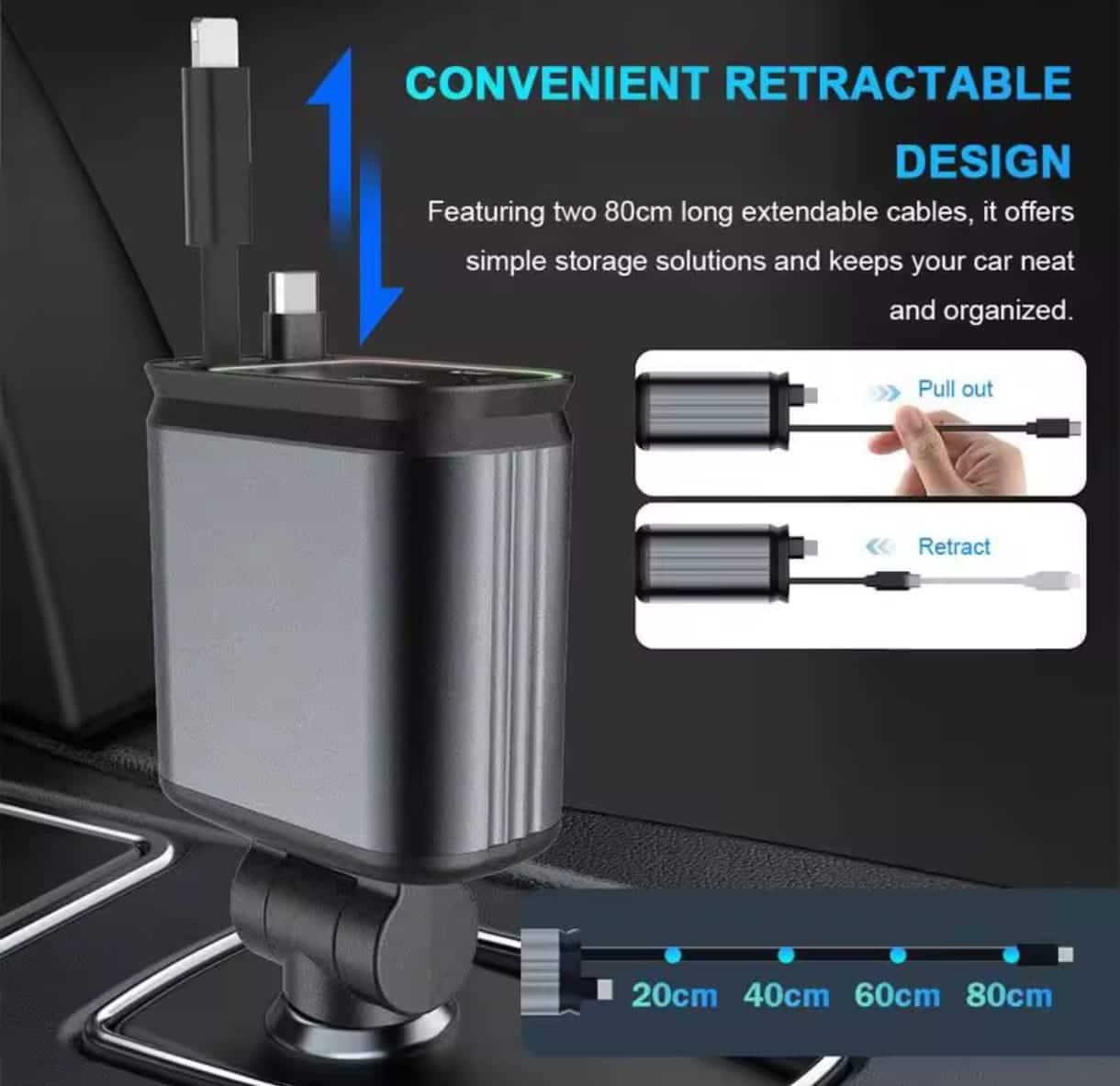 - Design Retractabil Inteligent: Cablurile retractabile previn încurcarea și permit ajustarea lungimii până la 80 cm, menținând organizat interiorul mașinii.