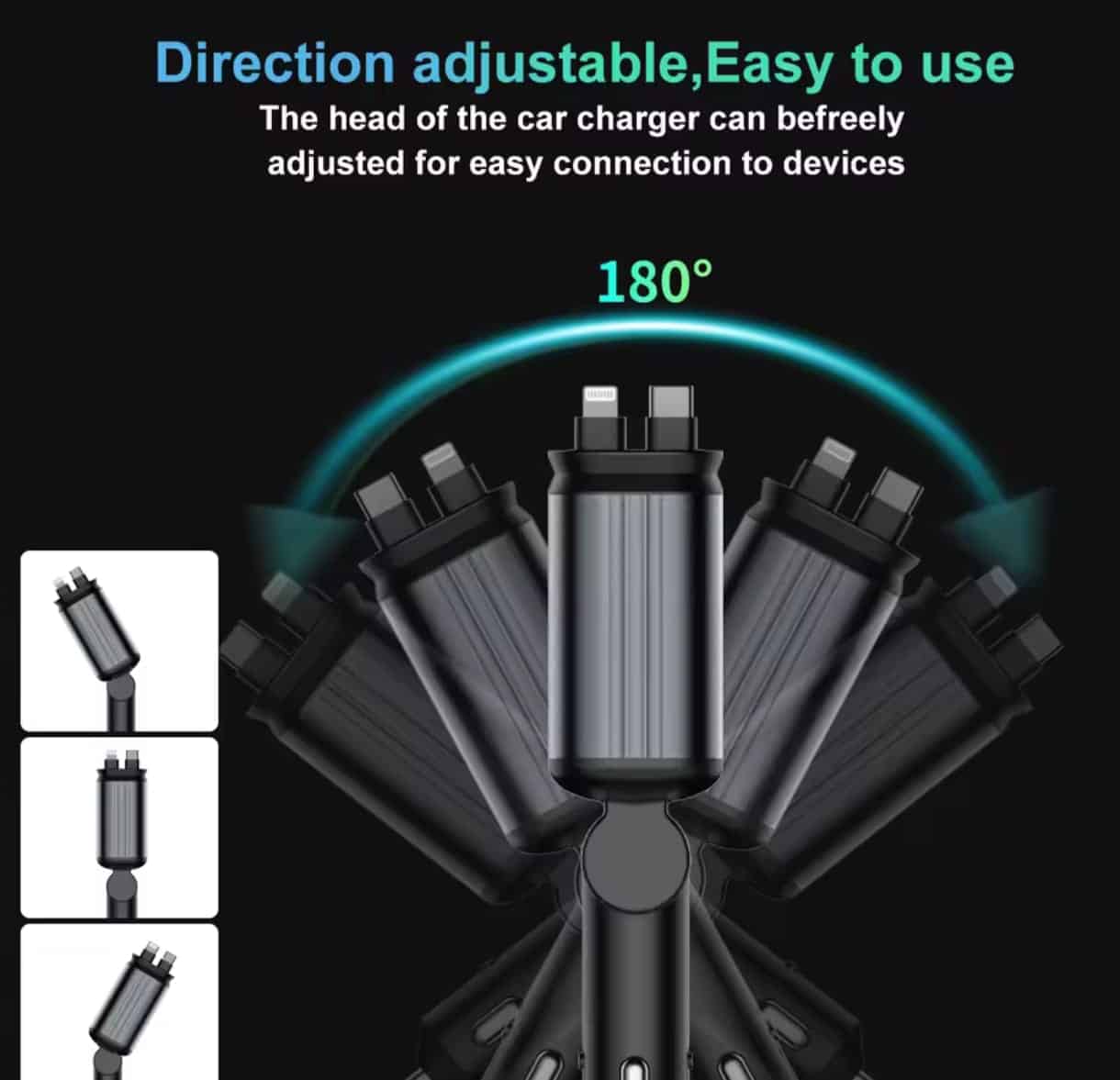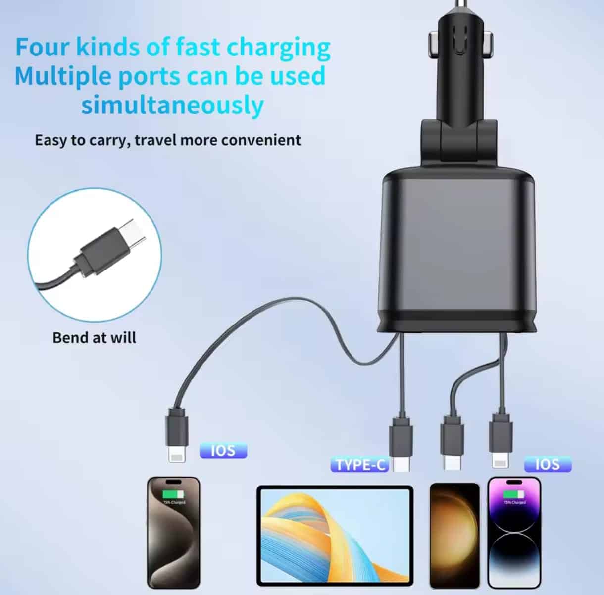 Cu două porturi USB-A și un port USB-C de înaltă putere (până la 12V/3A), acest încărcător auto permite alimentarea simultană a până la patru dispozitive. În plus, include două cabluri retractabile — unul pentru iPhone și unul Type-C — fiecare cu lungimea reglabilă până la 80 cm. Astfel, cablurile nu doar că rămân ordonate, dar sunt mereu la îndemână, fără riscul de încurcare sau pierdere.