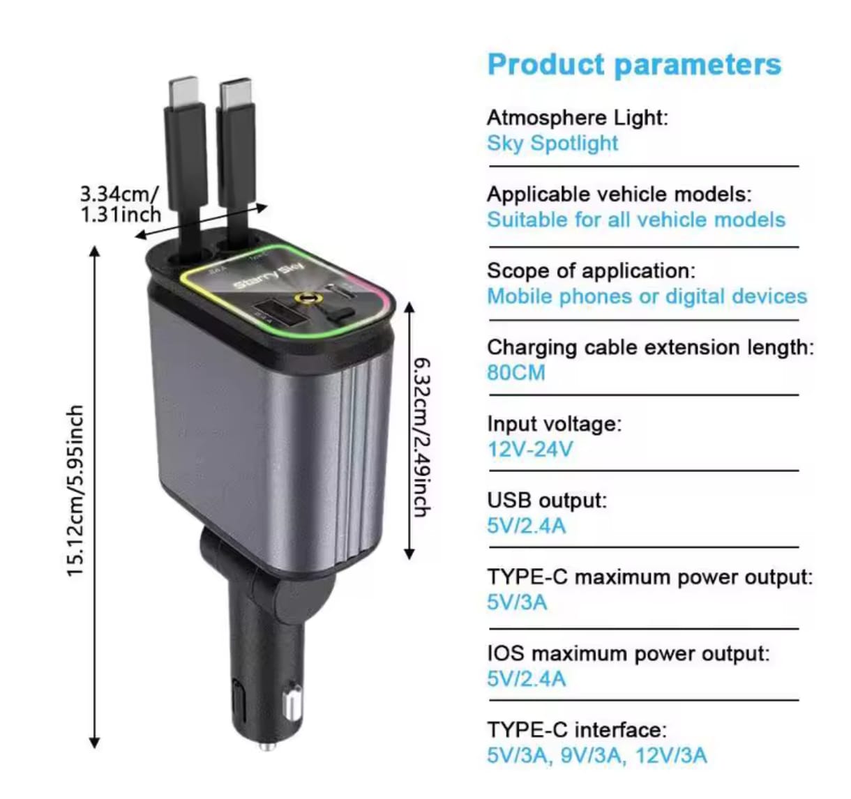 - Ieșire pentru iPhone și Type-C retractabile: 5V/2.4A