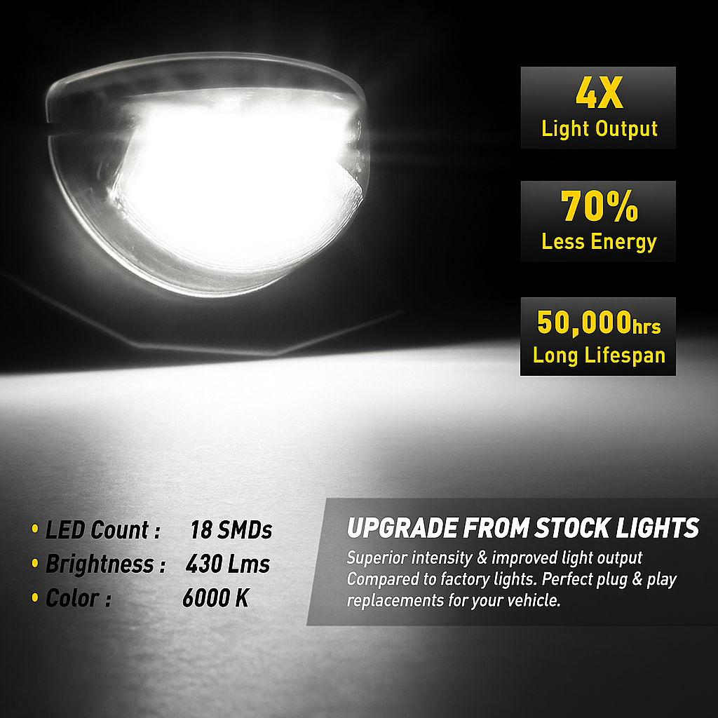 Fiecare lampă este echipată cu 18 LED-uri SMD de înaltă calitate, integrate într-o carcasă rezistentă, complet etanșă, cu standard de protecție IP67. Astfel, produsul este perfect protejat împotriva prafului și apei, ceea ce îl face potrivit pentru orice condiții meteorologice. Durata de viață depășește 50.000 de ore de funcționare, iar tensiunea de operare de 12V este compatibilă cu sistemele standard ale vehiculelor. Designul compact și sistemul de montare Plug & Play permit înlocuirea rapidă a lămpilor OEM, fără adaptări sau unelte speciale.