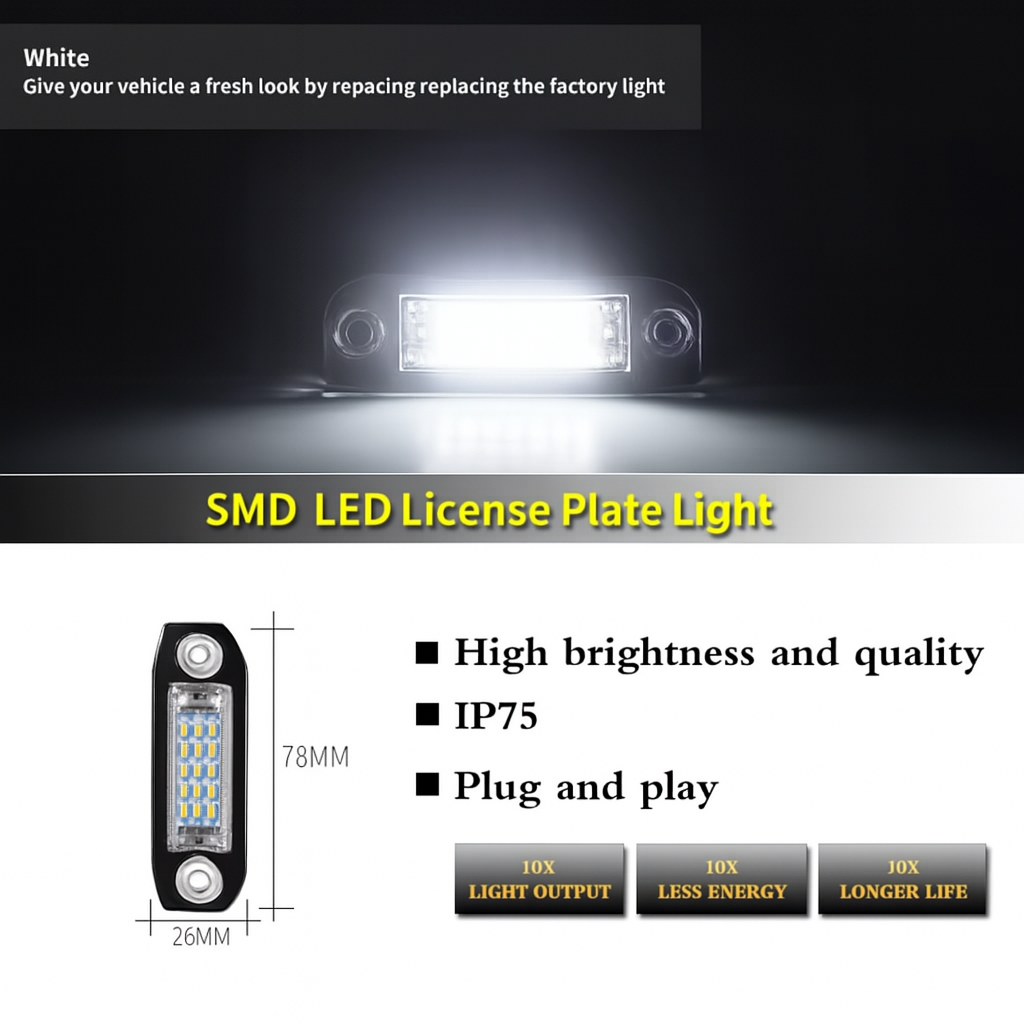 Compatibilitatea este excelentă pentru o gamă largă de modele Volvo fabricate între 2003 și 2015. Printre acestea se numără C30, C70, S40, S60, S80, V50, V60, V70, XC60, XC70 și XC90. De asemenea, lămpile sunt compatibile cu coduri OEM specifice, precum 30634190, 30753839 și 31253006, ceea ce oferă încredere totală în montajul perfect și funcționarea optimă. Indiferent dacă se dorește o actualizare estetică sau o creștere a eficienței în iluminarea plăcuței, acest set de lămpi LED este o alegere completă și practică.