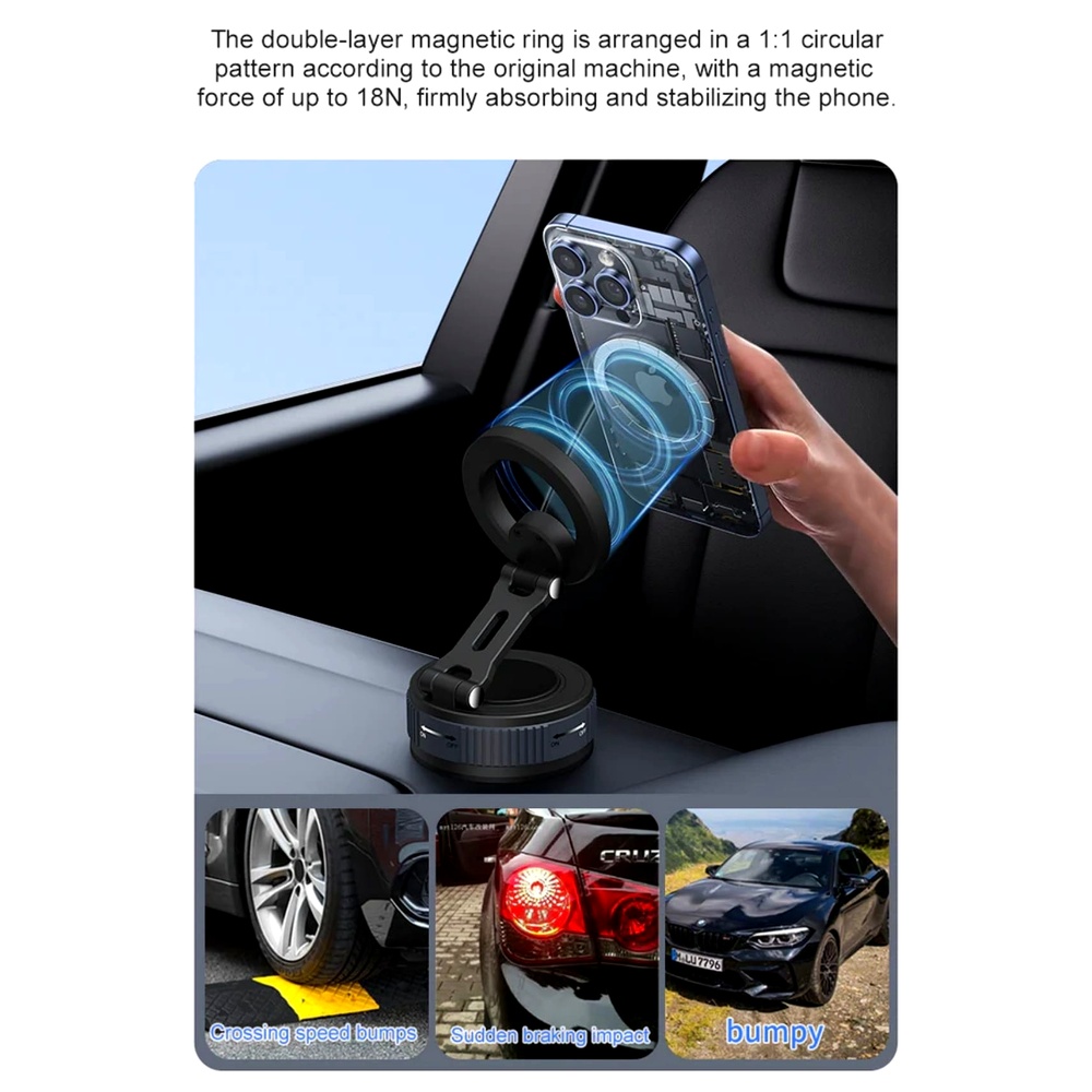 Acest suport telefon auto magnetic cu ventuză puternică este conceput pentru șoferii care își doresc un acces rapid și sigur la telefon în timpul condusului, fără a compromite atenția sau confortul. Este o soluție modernă și eficientă pentru utilizarea zilnică a aplicațiilor de navigație, apelurilor hands-free sau a altor funcții esențiale ale smartphone-ului, oferind stabilitate excelentă chiar și în condiții de drum dificile.